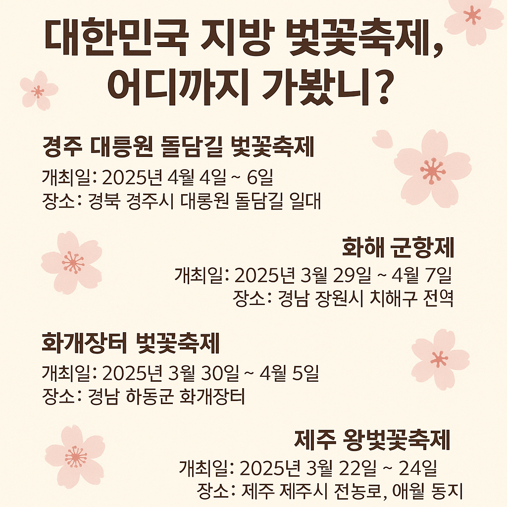오늘은 2025년 봄, 대한민국 지방 벚꽃축제 중 꼭 가볼 만한 장소들을 추천해드릴게요.
